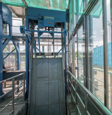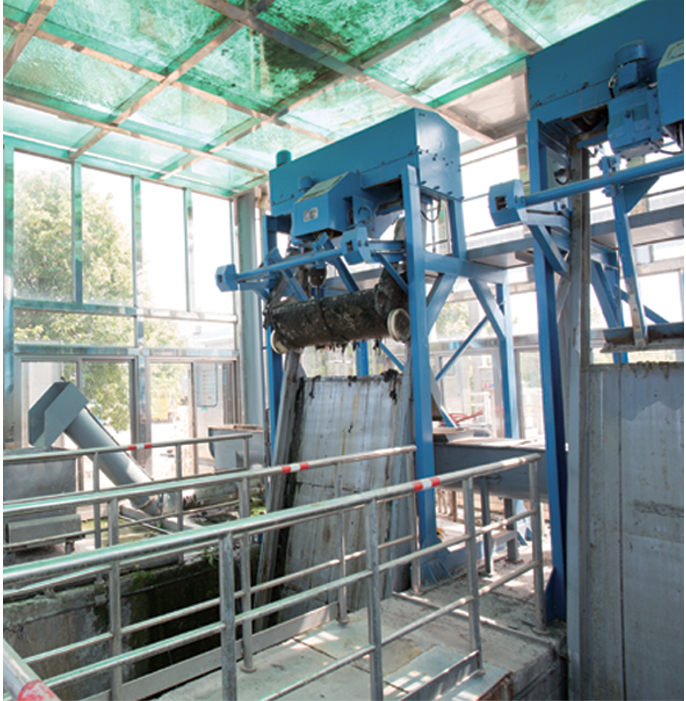 该设备采用跨井式、钢丝绳牵引式,由耙斗和固定栅条组成过水栅面,当污水流经栅面,大于栅隙的杂物被拦截;耙斗先由翻耙电机驱动,完成开翻动作后停止,再由升降电机驱动,并在高度限制器的控制下,沿两侧导轨下降至格栅井底部后停止,并再次自动开启翻耙电机,完成合耙动作后停止,升降电机又再次启动,耙斗在钢丝绳的牵引下,插入栅条间隙中,将拦截的杂物捞起,并沿着栅面、挡渣板上升,在高度限制器控制下,在到达卸料口位置后,升降电机停止,上机架处的清污刮板随耙斗的上升动作自动将杂物刮除,从卸料口中落入输送机或垃圾小车上,一次清捞过程完成。